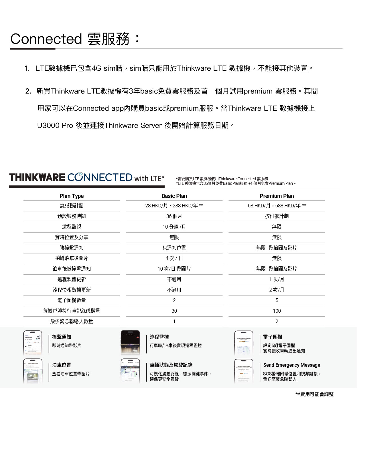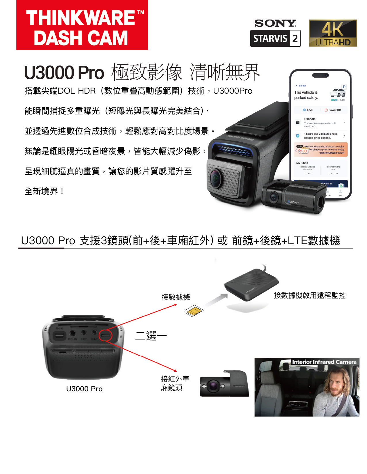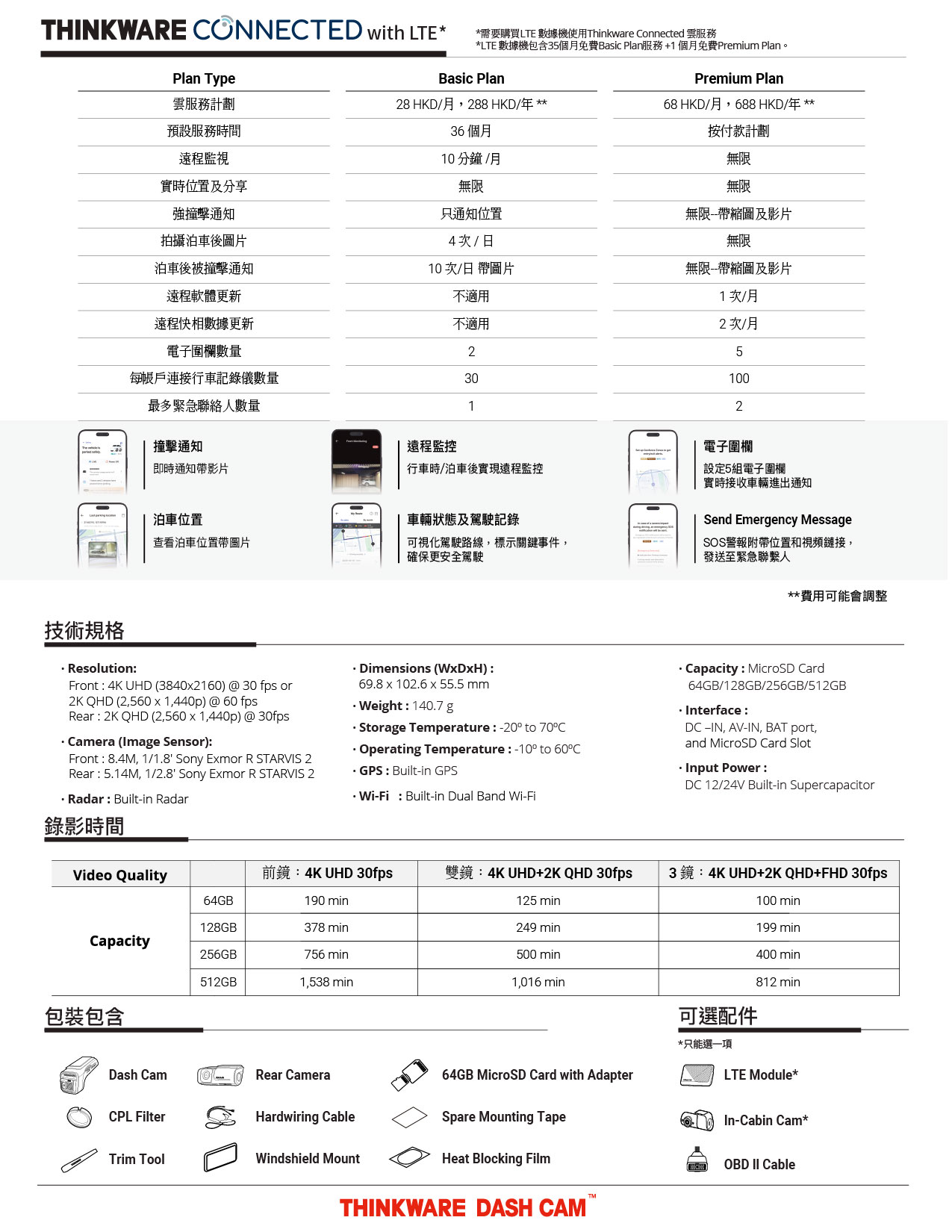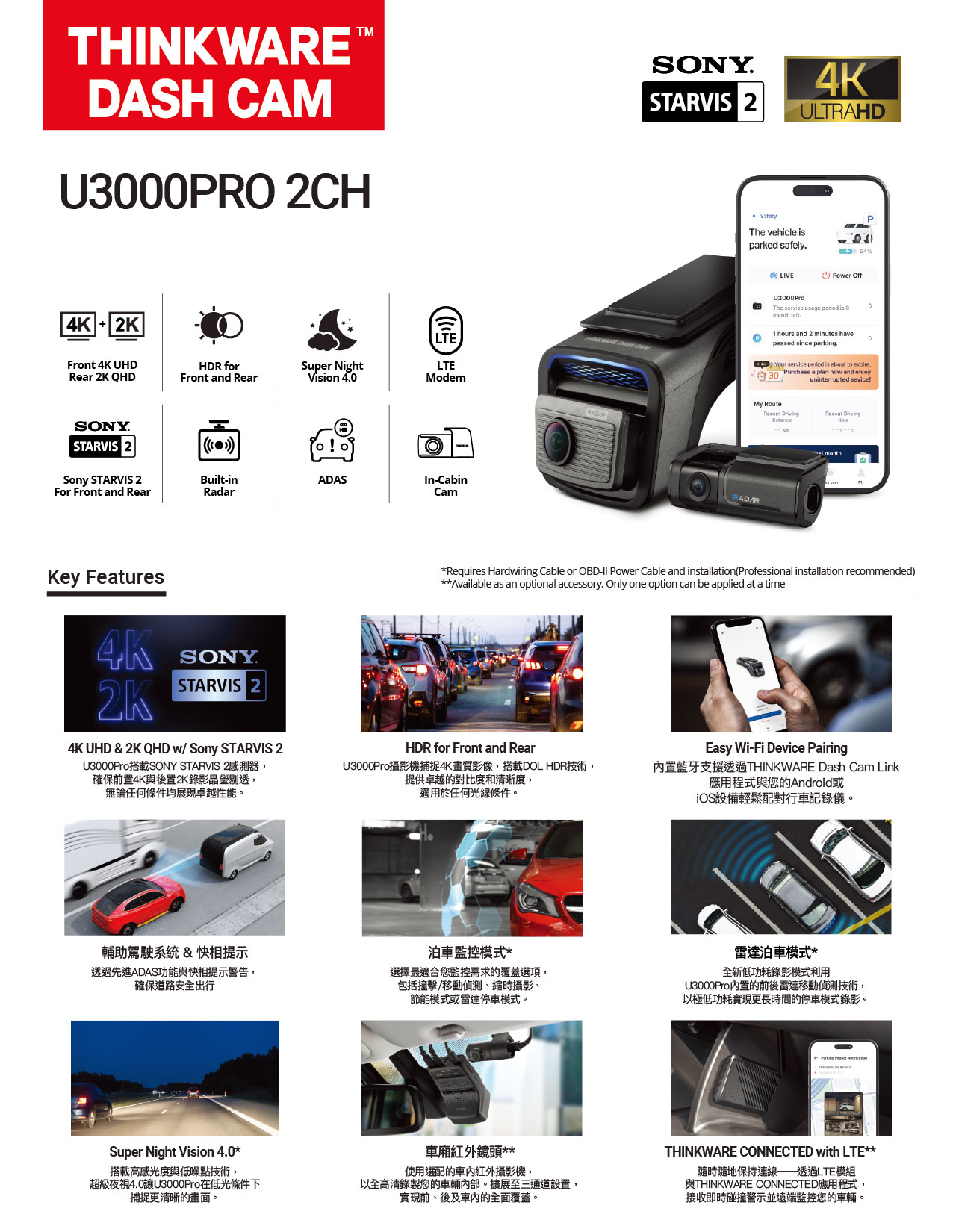 4K UHD – 2K QHD 2-Channel | 4K Image Quality Settings | Super Night Vision 4.0 | Built-in Dual RADARBuilt-in Wi-Fi & Bluetooth | Smart Parking Mode | New ADAS | Energy Saving 2.0 | THINKWARE CONNECTEDTime Lapse | Safety Camera Alert | 147º-156º Wide Viewing Angle | Built-in GPSMobile APP (Android/iOS) | Windows/Mac Viewer