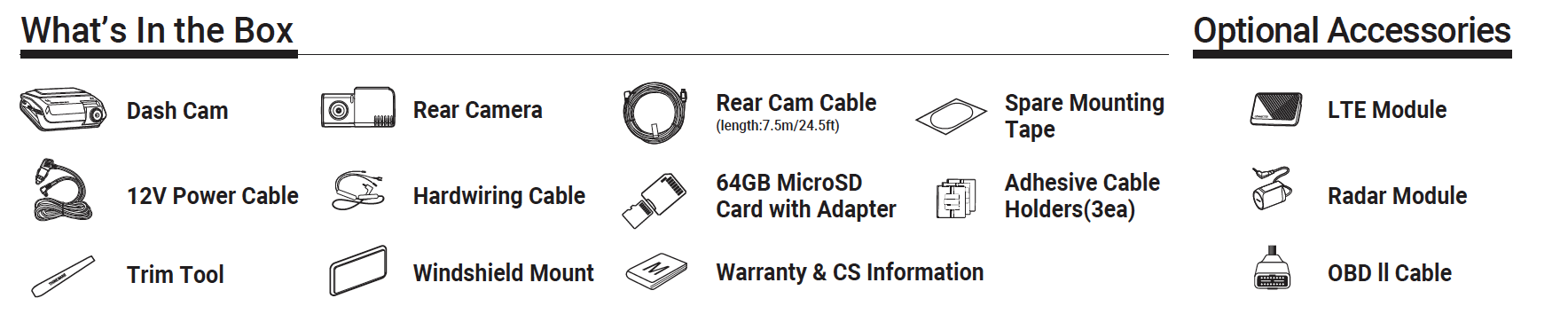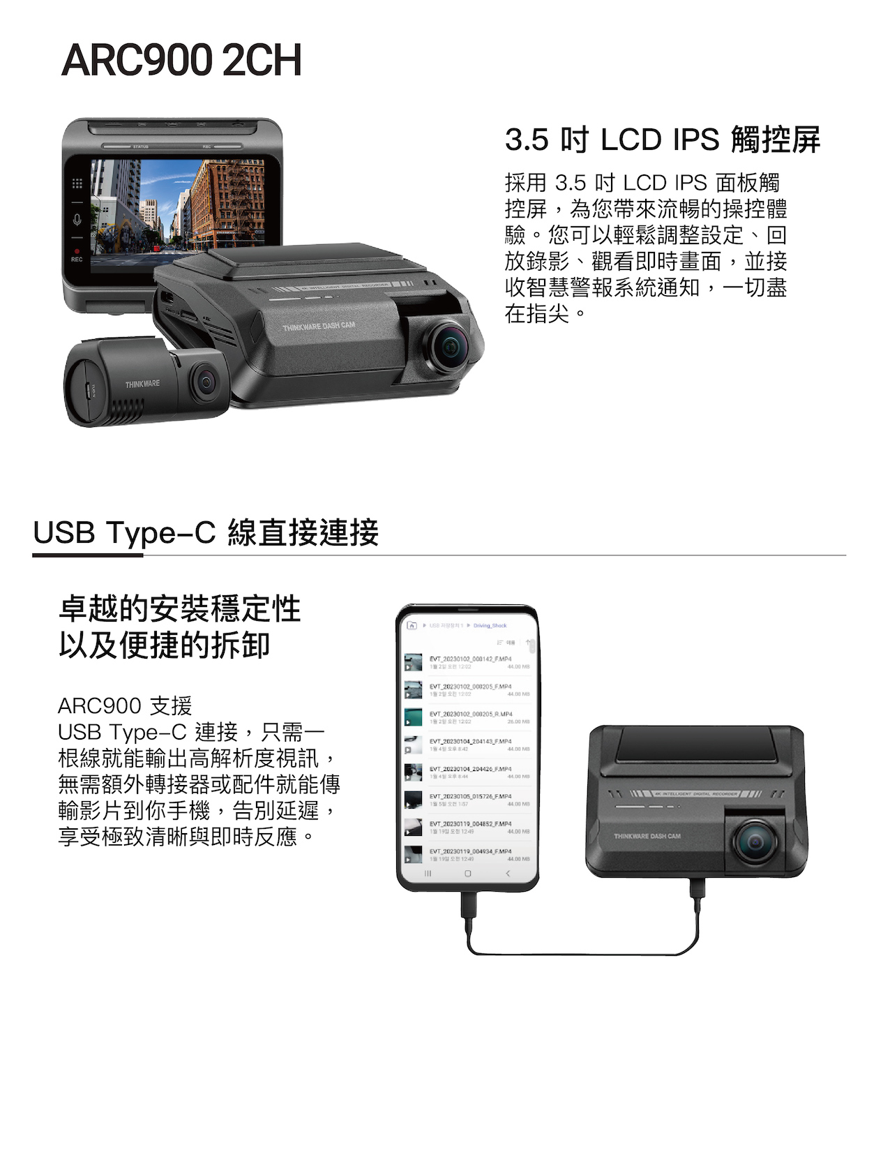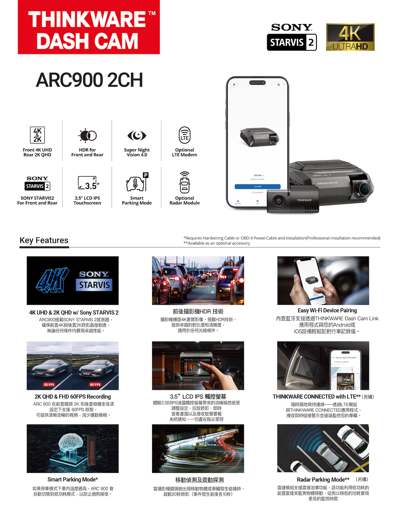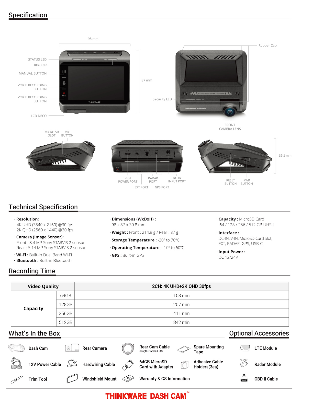 4K UHD – 2K QHD 2-Channel | 4K Image Quality Settings | Super Night Vision 4.0 | Built-in Wi-Fi & Bluetooth | Smart Parking Mode | New ADAS | Energy Saving 2.0 | THINKWARE CONNECTED | Time Lapse | Safety Camera Alert | 147º-156º Wide Viewing Angle | Built-in GPS| Mobile APP (Android/iOS) | Windows/Mac Viewer
